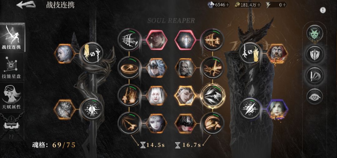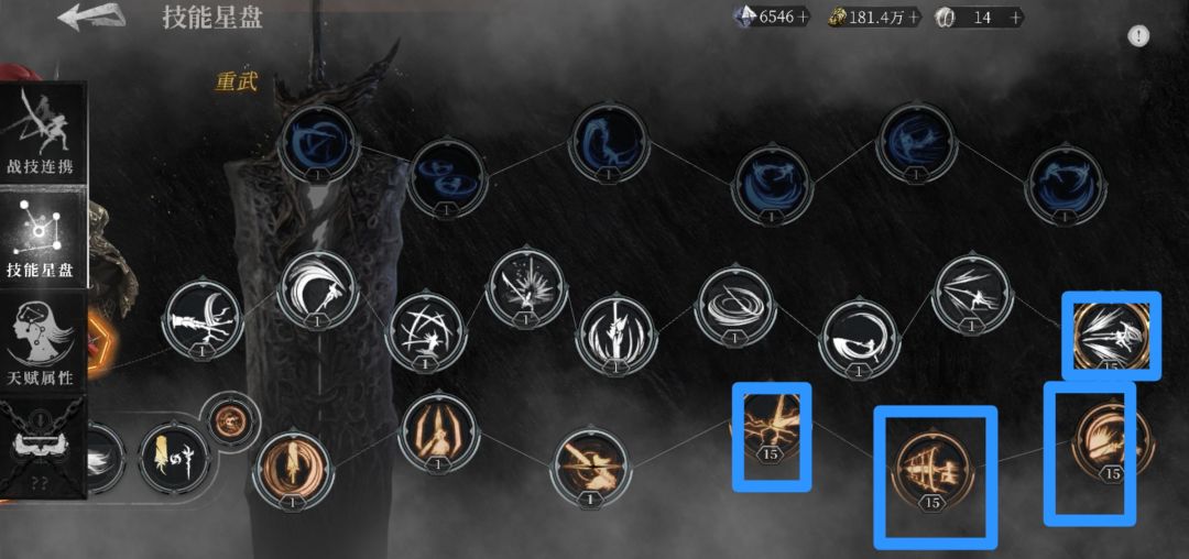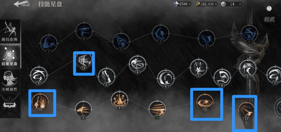 冰系输出海拉追求的是轻武器输出拉满,所以一般技能选择是施法比较快不墨迹且带破招的技能如图,技能与核魂的搭配可参考下图