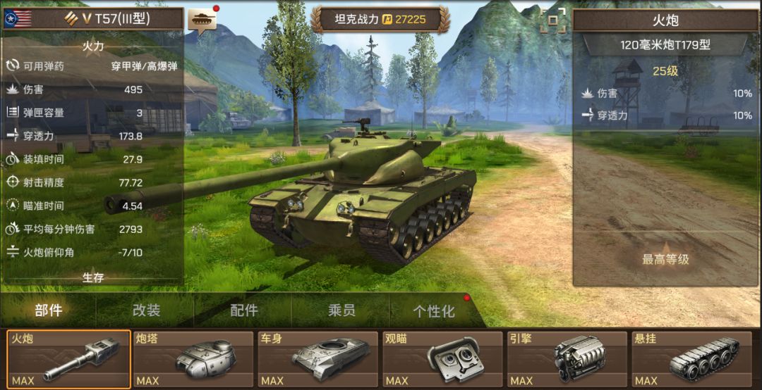 T57坦克是在M103坦克底盘的基础上安装了带自动装弹机的120毫米火炮的摇摆炮塔,与同样安装120毫米火炮的T34坦克相比,炮塔外形小了很多。