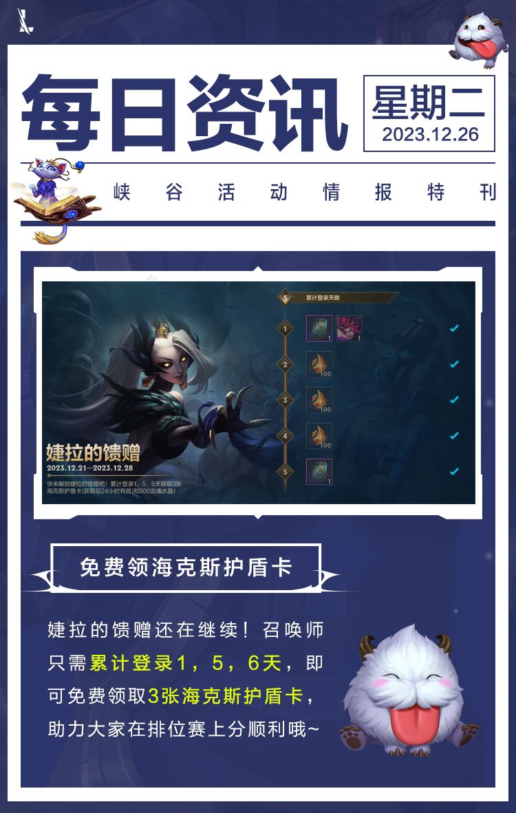 排位上分的“保命利器”来啦!截止至12月28日,召唤师只需累计登录1、5、6天就可获取海克斯护盾卡(1天)*3和龙魂水晶*500!
