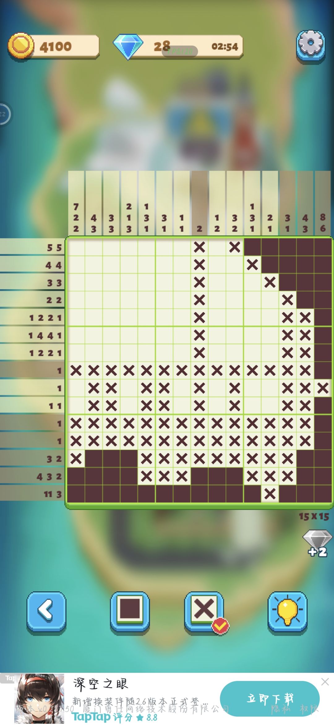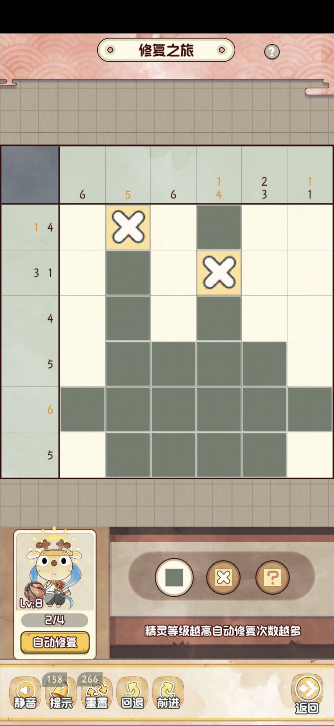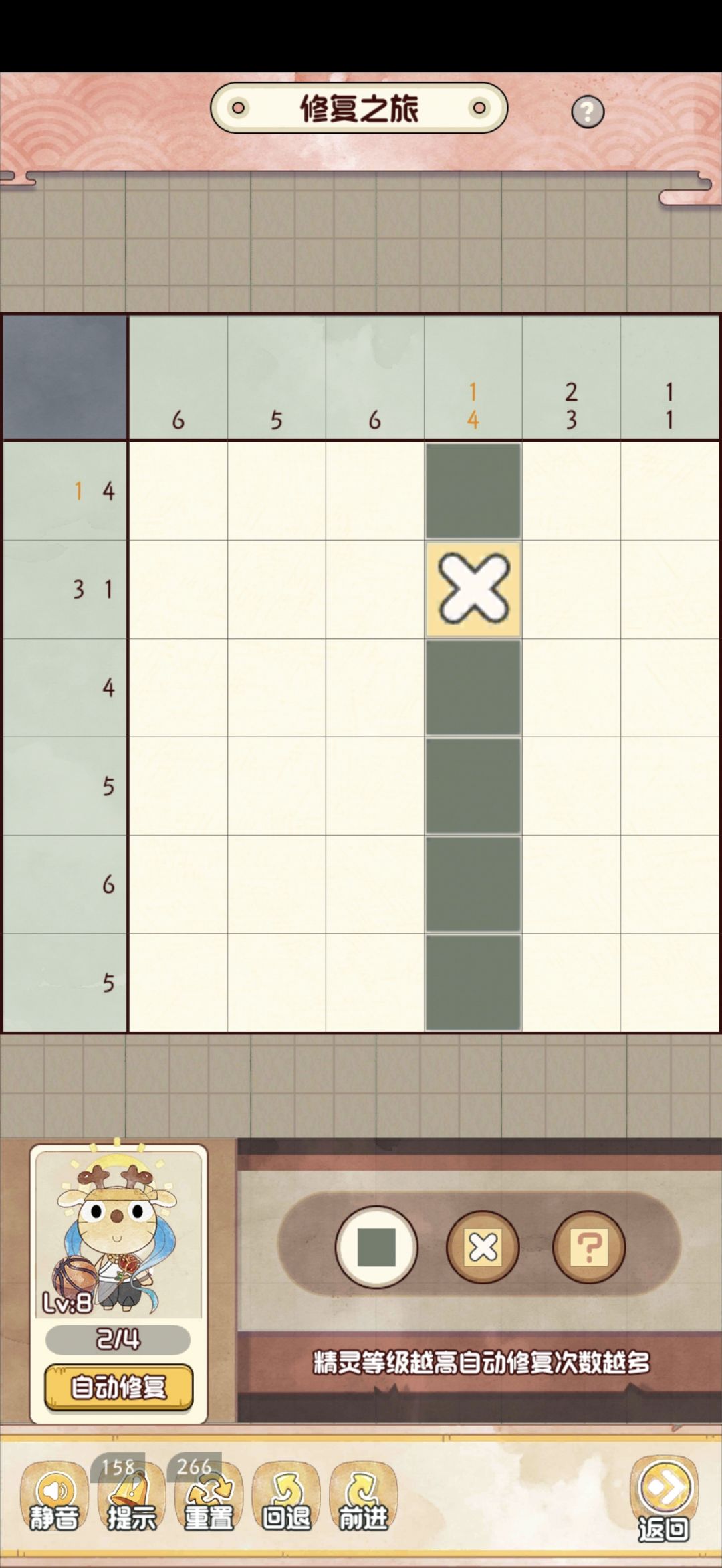这里主要讲数涂的机制。基础的玩法在第一关的教程里面已经介绍的差不多了。关卡里可以使用鹿精灵跳关。根据你鹿精灵的等级来决定次数,每2级可以跳一次,即2级1次,4级2次,6级3次,8级4次。这里指的应该是你所有鹿里面最高的等级。也就是说如果你的鹿最高是8级,你今天一共可以跳4次。跳关的方式就是直接通关这一关,然后把奖励给你。