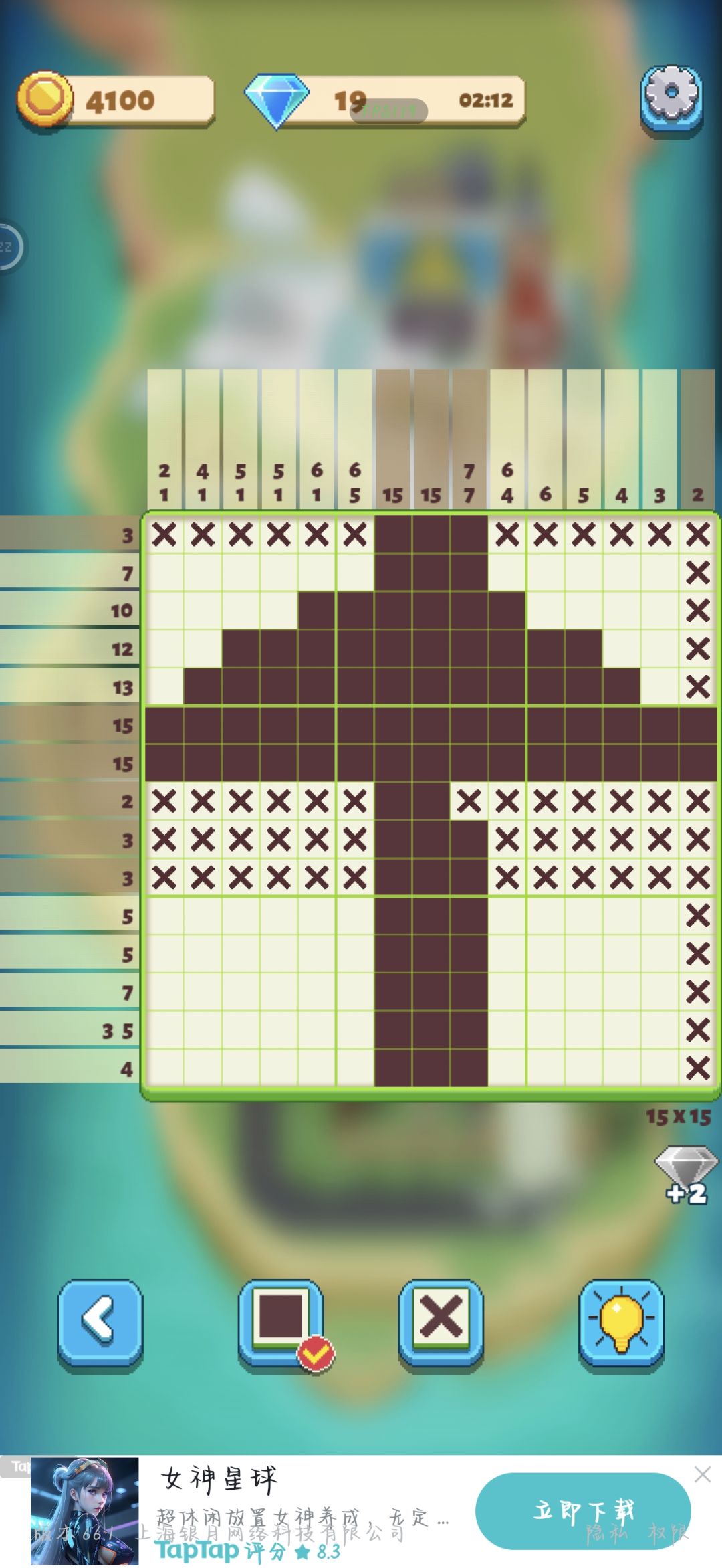还是首先遵循大数定则。先涂满15的行列。再涂上7,7的唯一排列。及时确立边界封叉。接下来大部分行的可行空间都不再是15,变得更小了。所以我们要对超过14/2=7的数字行重新填补涂色。