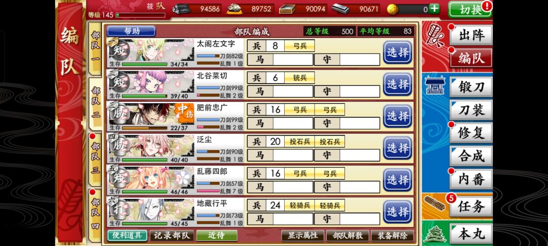 2.本人懒,直接从原编队搬来的刀,没换刀装,为了省资源着想短胁轻步,打刀轻骑