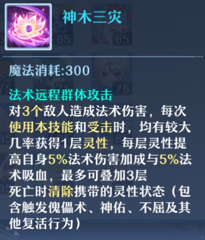 神木三灾:可造成大量法系伤害,并为自身提供法伤加成、法术吸血加成