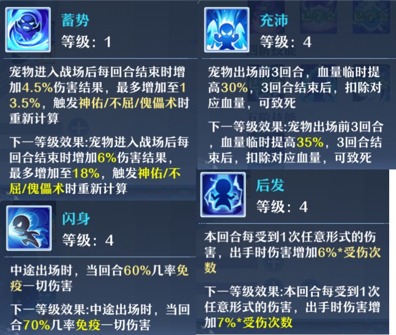 高级神佑:宠物死亡时几率复活,回复100%生命。不和傀儡术共存