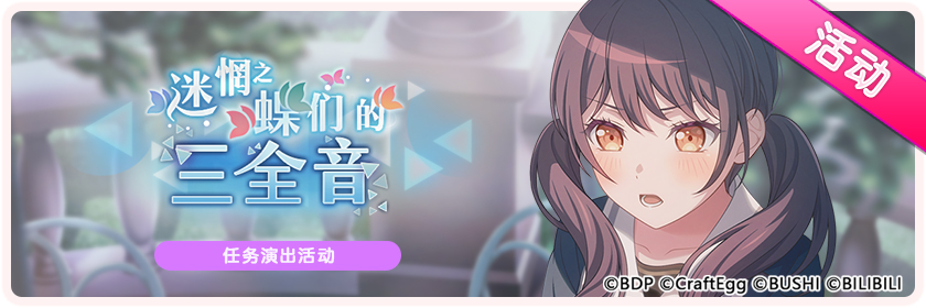《BanG Dream! 少女乐团派对!》将于明日13:00~15:00进行约2小时的例行维护。维护后将开启「迷惘之蝶们的三全音」任务演出活动。维护期间您将无法登录游戏,未完成的演出将无法进行结算。还请各位BanG Dreamer合理安排游戏时间,及时做好下线准备,非常感谢您的支持与配合。