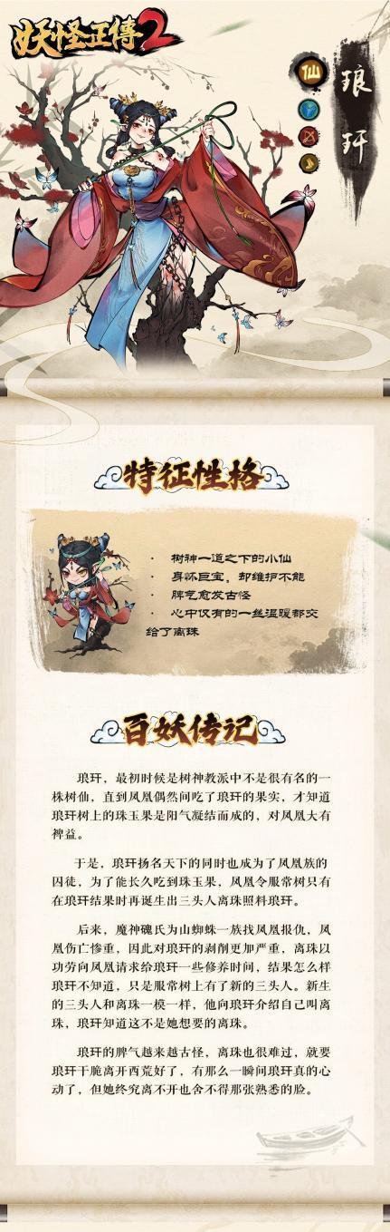 琅玕,最初时候是树神教派中不是很有名的一株树仙,直到凤凰偶然间吃了琅玕的果实,才知道琅玕树上的珠玉果是阳气凝结而成的,对凤凰大有裨益。于是,琅玕扬名天下的同时也成为了凤凰族的囚徒,为了能长久吃到珠玉果,凤凰令服常树只有在琅玕结果时再诞生出三头人离珠照料琅玕。