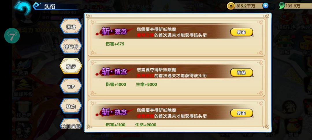 斩.痴念 你需要夺得斩妖除魔三生情劫的首次通关才能获得该头衔 伤害+787
