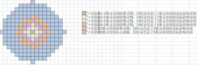 首先,要从聚灵阵的概念说起。前面提到灵气系数是可以改变的,改变的方法就是利用【聚灵物】来提高它周围一定范围格子内的灵气系数,提高的数值取决于聚灵物的聚灵系数和聚灵范围。在这个范围内,离聚灵物本身所在的格子越近,聚灵效果也会更好,灵气系数就会越高。