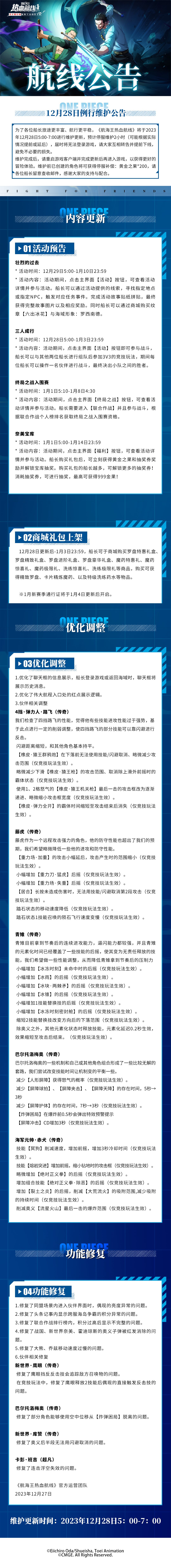 为了各位船长旅途更丰富、航行更平稳,《航海王热血航线》将于2023年12月28日5:00-7:00进行维护更新,预计停服维护2小时(可能根据实际情况提前或延后),届时将无法登录游戏,请大家互相转告并提前下线,避免不必要的损失。