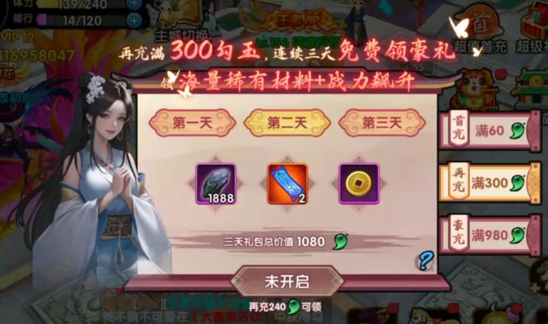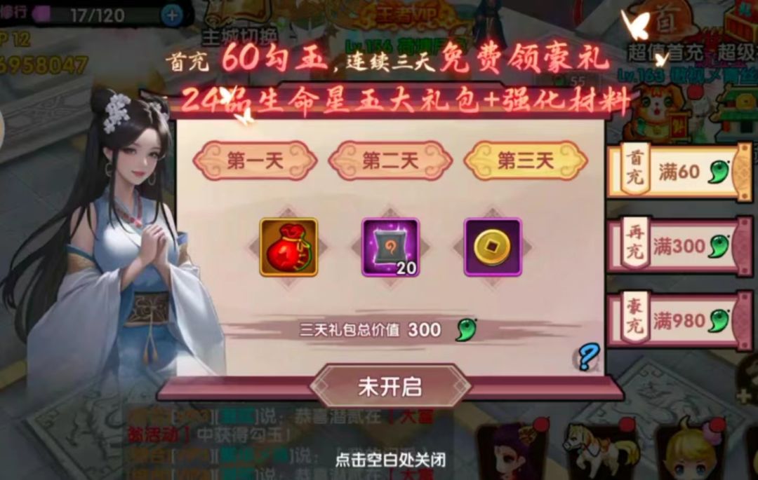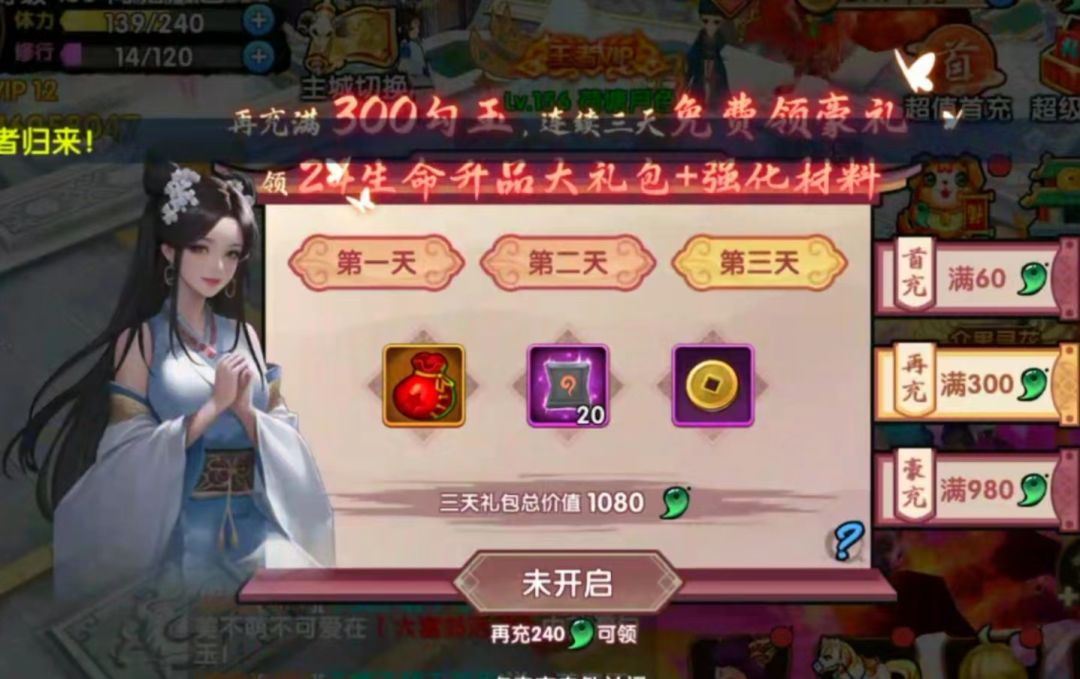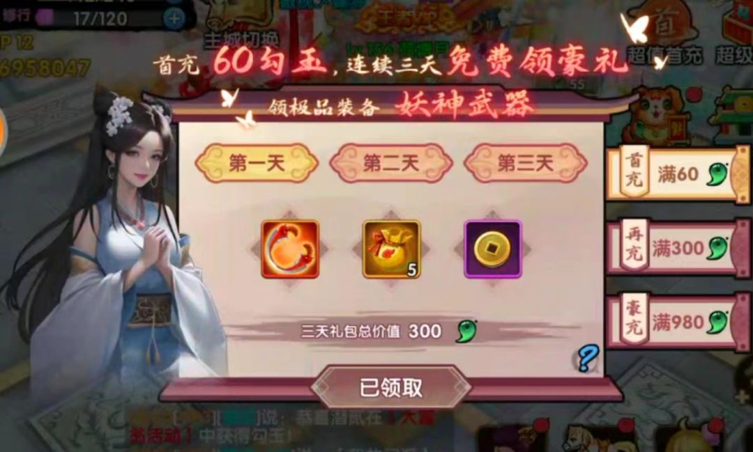 再充满300勾玉,连续三天免费领取豪礼。三天礼包总价值1080勾玉。