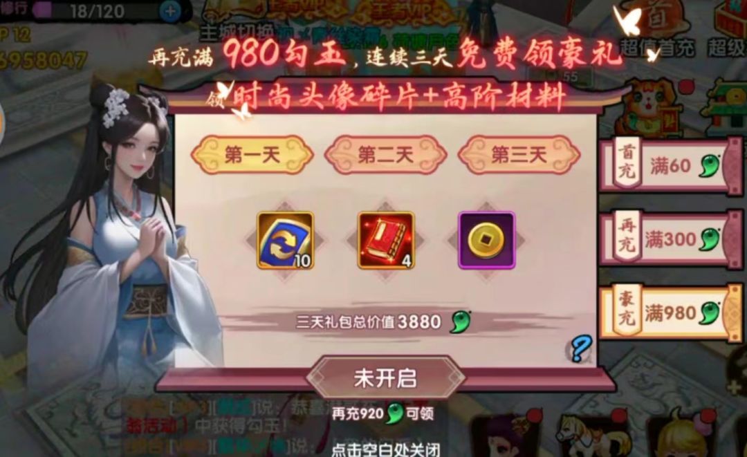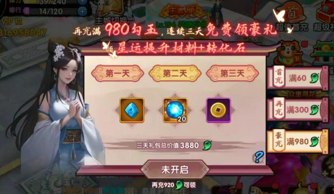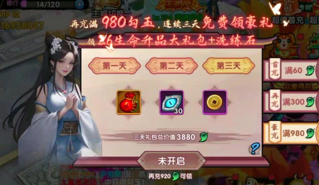 再充满920勾玉可领取,连续三天免费领豪礼。三天礼包总价值3880元。