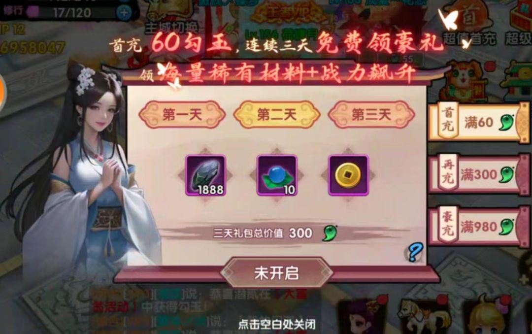 首充60勾玉,连续三天免费领取豪礼。三天礼包总价值300玉。