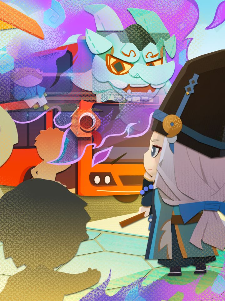 一串奇怪的鸣笛声传来,宛如庭院的场景渐渐展开:蔓延的迷雾包裹着一具庞大的身体,鬼面和灯笼在雾中若隐若现,静坐其上的乘客也并非人类的模样。眼前胧车的到来,让我不由得产生了怀疑。若是普通人类看见这副异常的样貌定会吓得四散逃走,可眼下的情况却完全相反。人类们非但没有逃离,在听见鸣笛声后反而慢慢聚集,准备排队登车。莫非是连续的观测使得我出现了幻象,否则胧车怎会出现在人类世界?虽然不甘,但仅凭眼前的线索暂时无法解开幻象之谜,不过可以确定的是目睹此等奇观的并非是我一个,否则晴明也不会表现得如此困惑了。