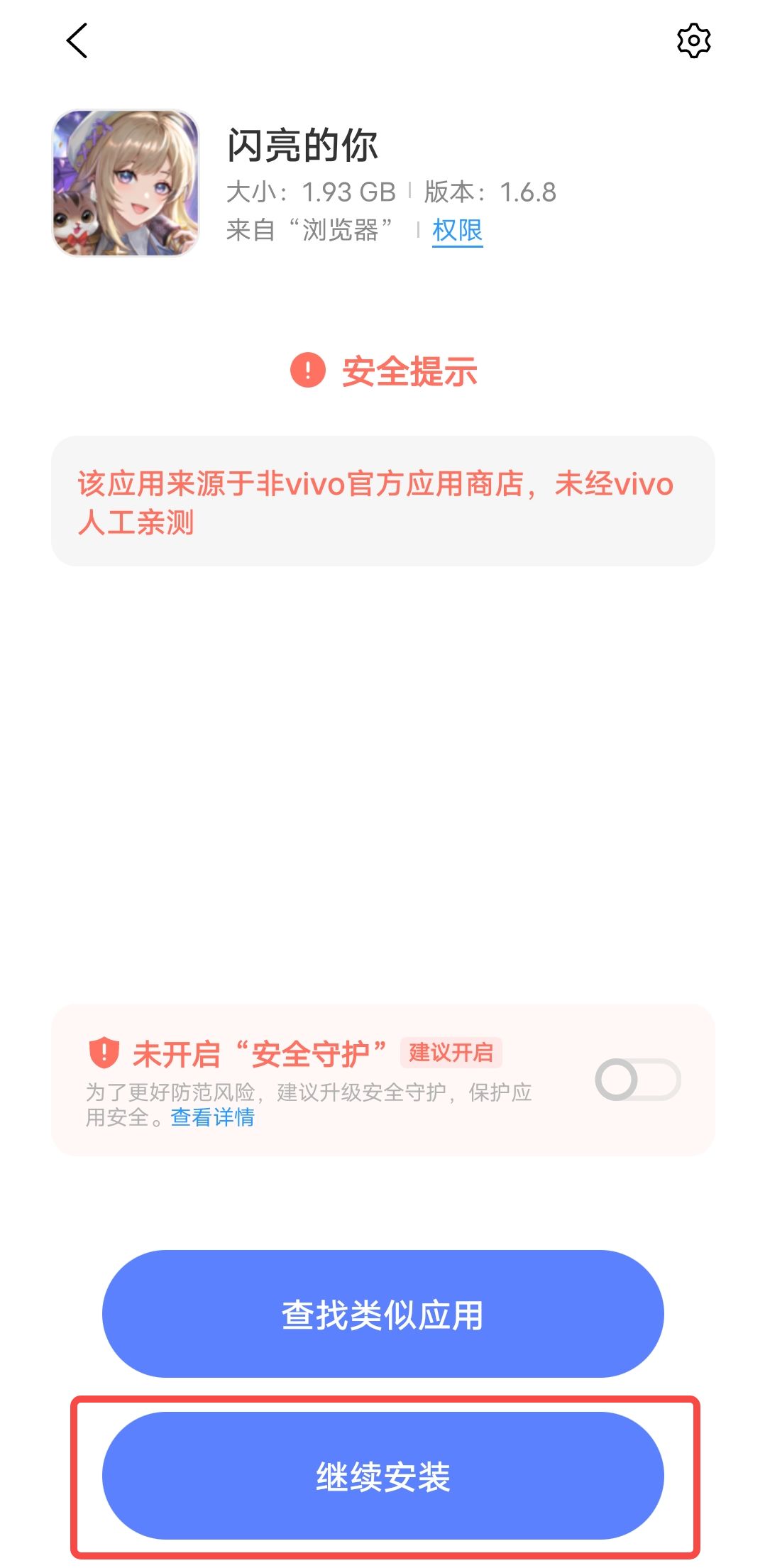 下载完成后,系统进行风险监测,可能会进行如下提示,点击【继续安装】