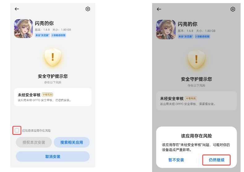 下载完成,系统进行扫描后会进行如下提示,选择【已知悉该应用存在风险】【仍然继续】