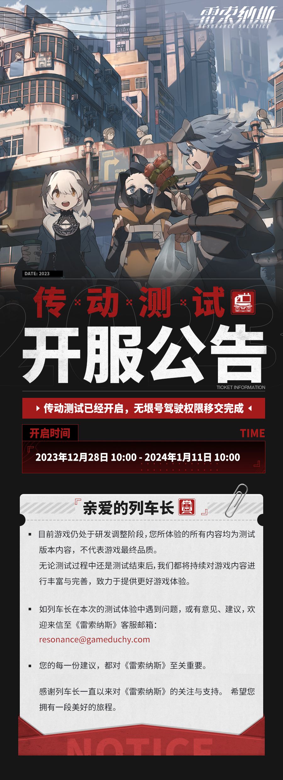 如列车长在本次的测试体验中遇到问题,或有意见、建议,欢迎来信至《雷索纳斯》客服邮箱resonance@gameduchy.com