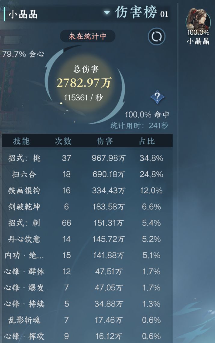 真题测试完,秒伤都在11W以上,这个是最后卡了波绝技打上来的,会好用很多,总耗时也只有241秒,目前我自己伤害最高的内功搭配了。