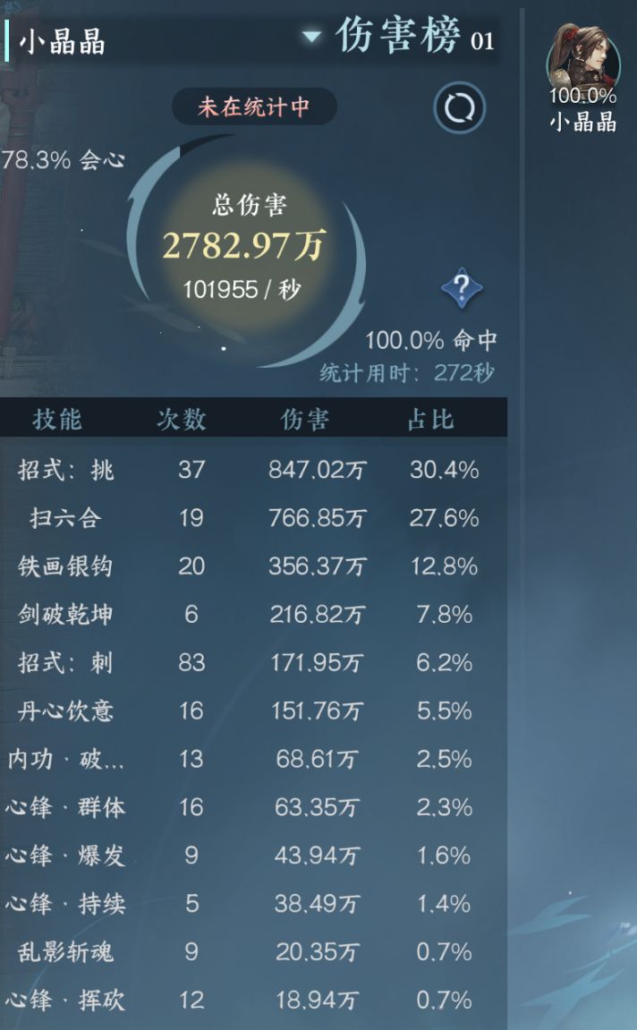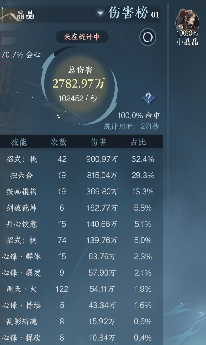 秒伤测试下来,扫六合的伤害和刺刺挑的伤害差距已经不是很大了,但是整体伤害不够,打木桩用了272秒,秒伤只有101955左右。
