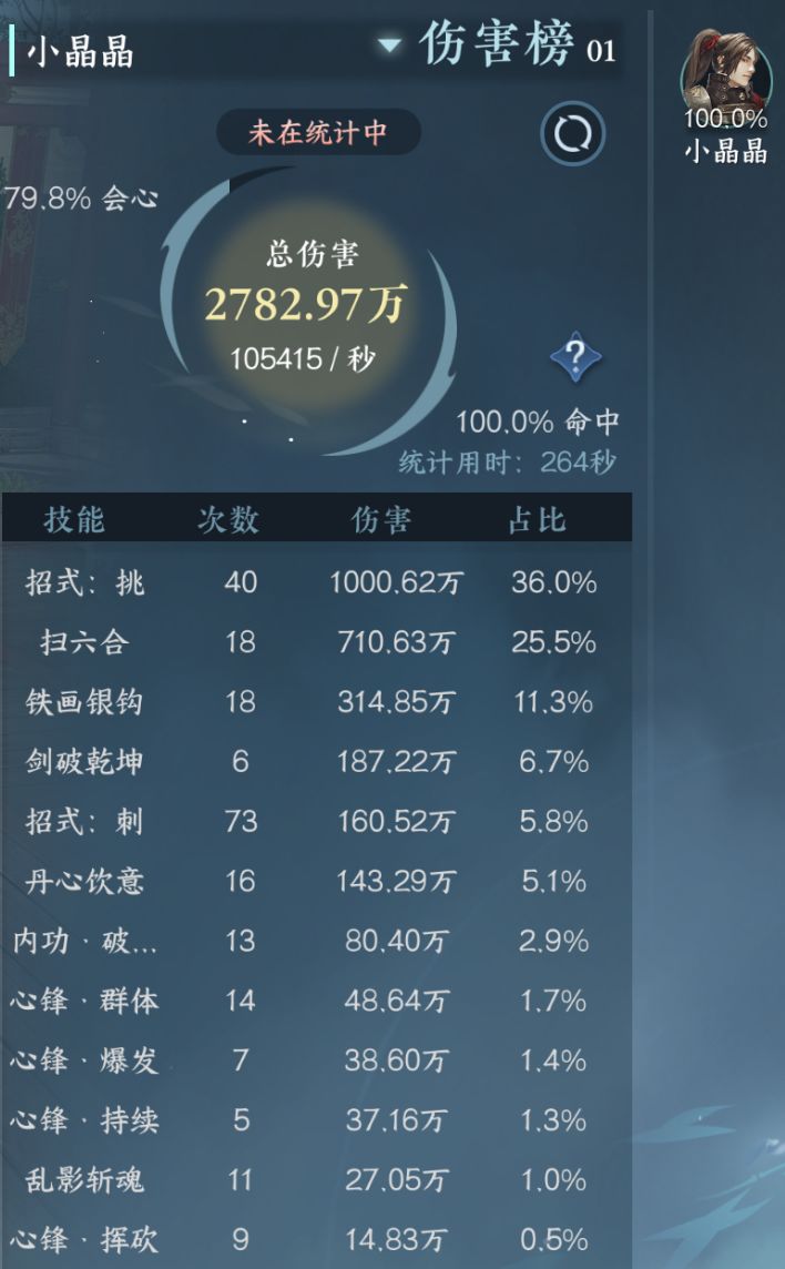 木桩打完的时间是264秒,伤害比灭阵高一些,整体秒伤高了3000左右。