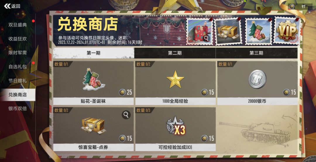 2023年12月22日-2024年1月7日期间,可选择指定系别的坦克进行个体经验收益加成。装饰进度越高,获得的加成效果越好(加成系别数量和加成坦克等级上限随装饰进度增加而提升)。