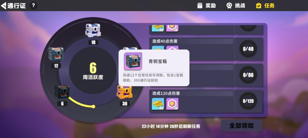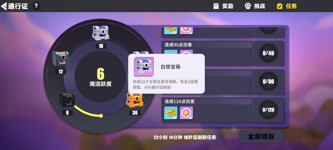 完成每日任务可以积攒任务数量,达到要求任务数量可以领取【宝箱】一共有2青铜,2白银,1黄金(每日任务数量的宝箱不需要宝箱钥匙开启,到达指定任务数量就可以免费开启)