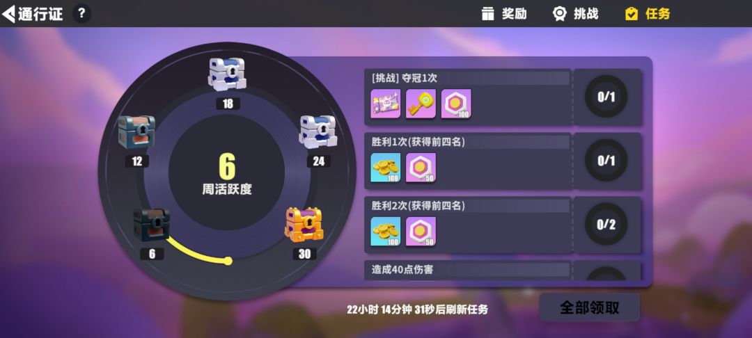 每天运气好完成一次前4名,一次夺冠,就可以完成任务,伤害不够就需要再打一局基本可以完成所有任务了