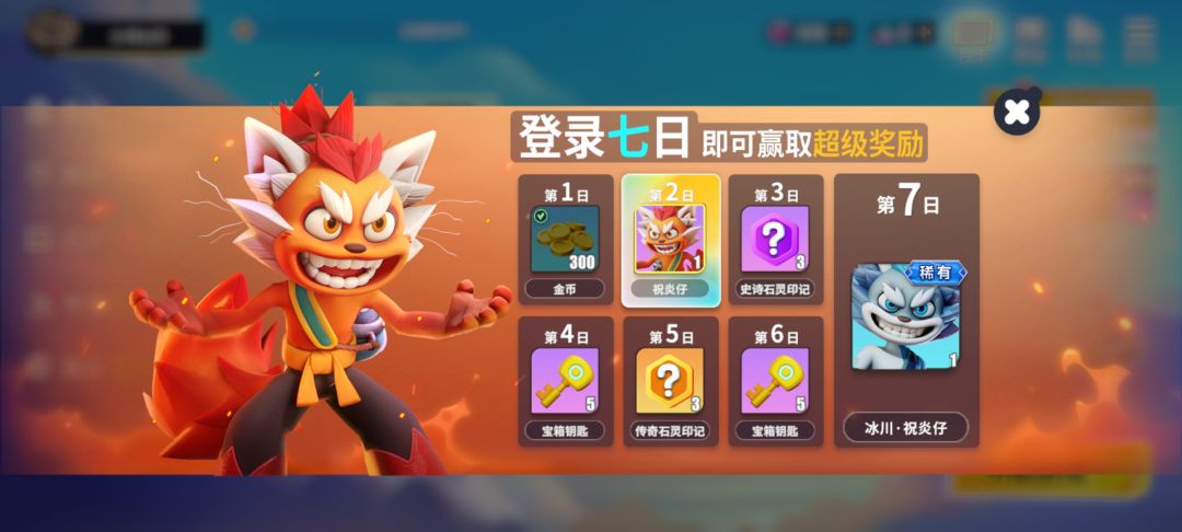 登录7天可以获得金币,强力英雄【祝炎仔】和其皮肤,石灵印记和10个寻宝用的【宝箱钥匙】,10连抽必出英雄,目前最好运气是1次10连获得4个英雄