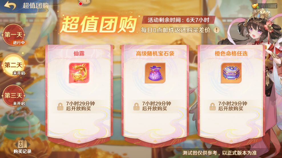 第二日参与团购的商品有:仙露、高级随机宝石袋、橙色命格任选。