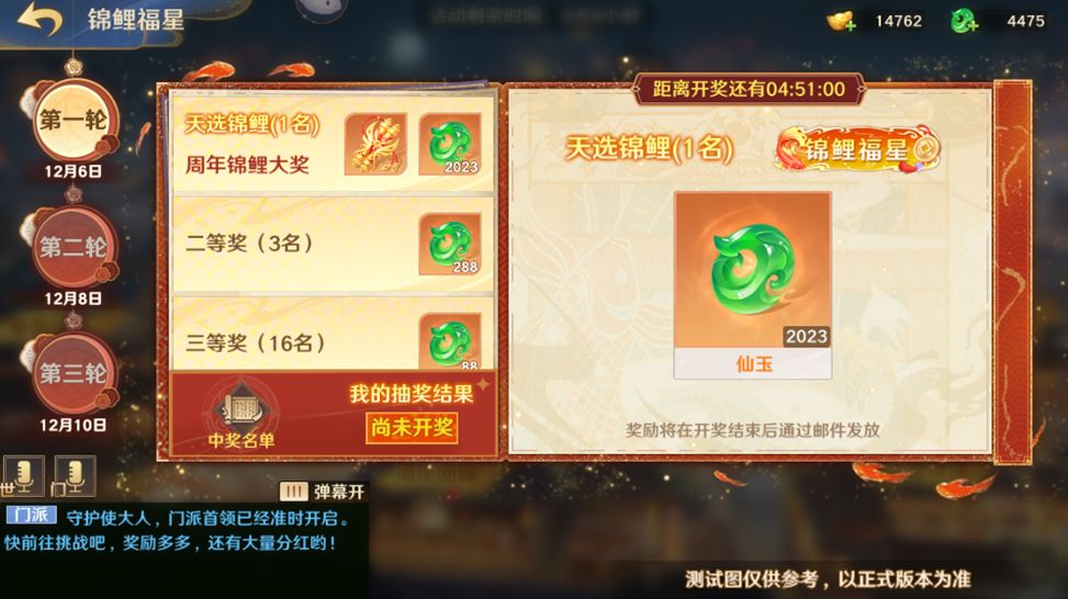 【天选锦鲤】1名,可获得2023仙玉和特别称号锦鲤福星;【二等奖】3名获得288仙玉;【三等奖】16名,获得88仙玉。其他参与的守护使大人也可获得参与奖288元宝!所有奖励均会在活动抽取后通过邮件发放。
