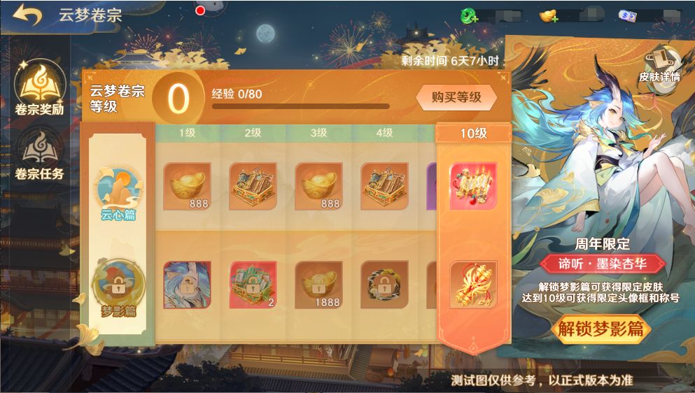 解锁豪华版奖励梦影篇的守护使大人在卷宗达到等级后可以获得谛听周年限定至尊皮肤·墨染杏华、周年限定头像框·卧云观梦、周年限定称号·卧云观梦、诗经任选箱*4、红·万能法宝*2、六阶宝石任选袋*1、稀有精炼石*30、元宝*3776以及云心篇所有对应等级奖励。