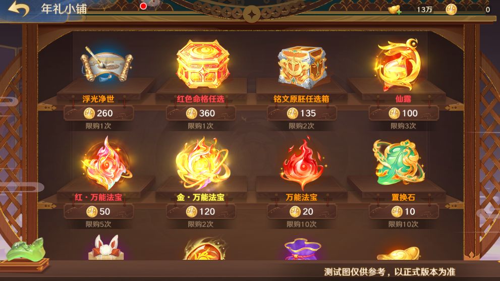 奖励中不仅有红色命格任选、铭文原坯任选箱、红·万能法宝、仙露、置换石等等道具奖励,还有周年限定主城皮肤·浮光净世可以兑换哦!开服时间≥21天的服务器,年礼小铺中还可以兑换金·万能法宝哦!
