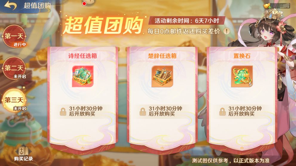 第三日参与团购的商品有:诗经任选箱、楚辞任选箱、置换石*5。