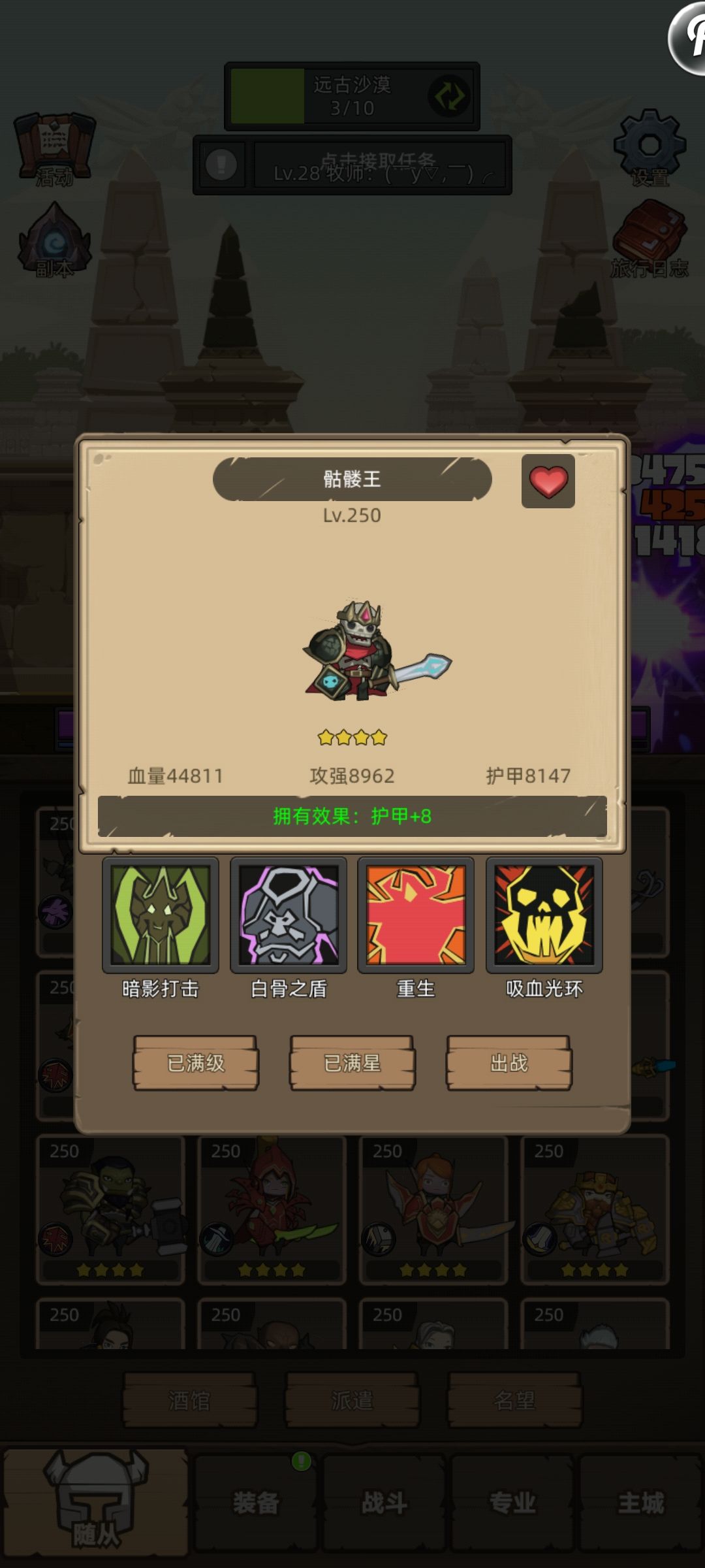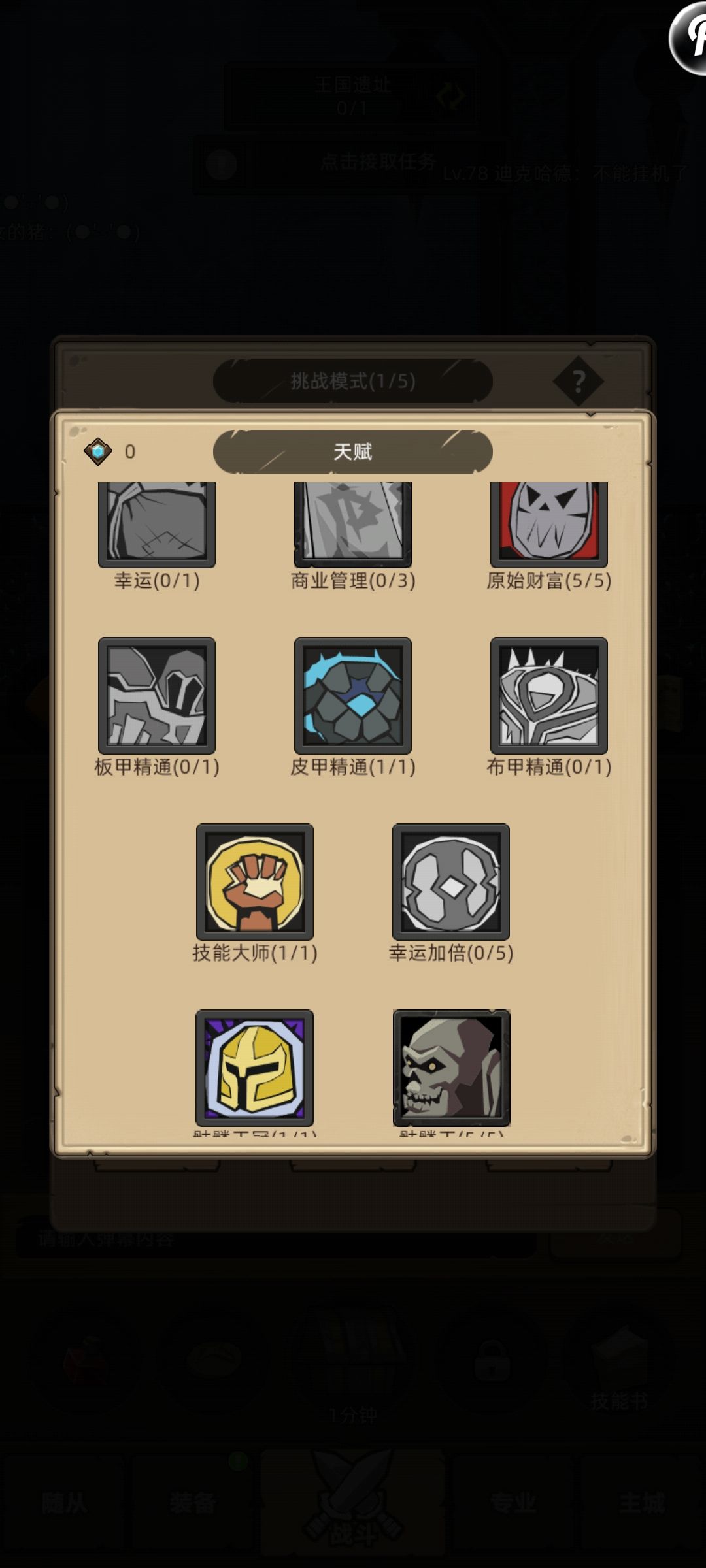 随着挑战次数的增加,这时候可以考虑开局前天赋提升下了,首先可以加5层攻击,第二层原始财富+5,第三层皮甲精通【别点错了,后面越打越容易,装备半价】,第四层技能大师【常规技能三选一,有了这个,可以四选一,出好技能概率加了点】第五层第六层属于养成资源,增加实际角色属性以及四星骷髅王……电满就毕业了……