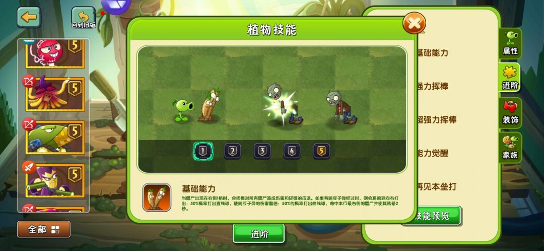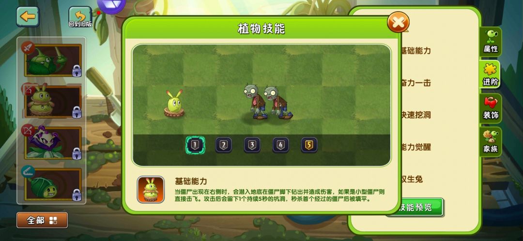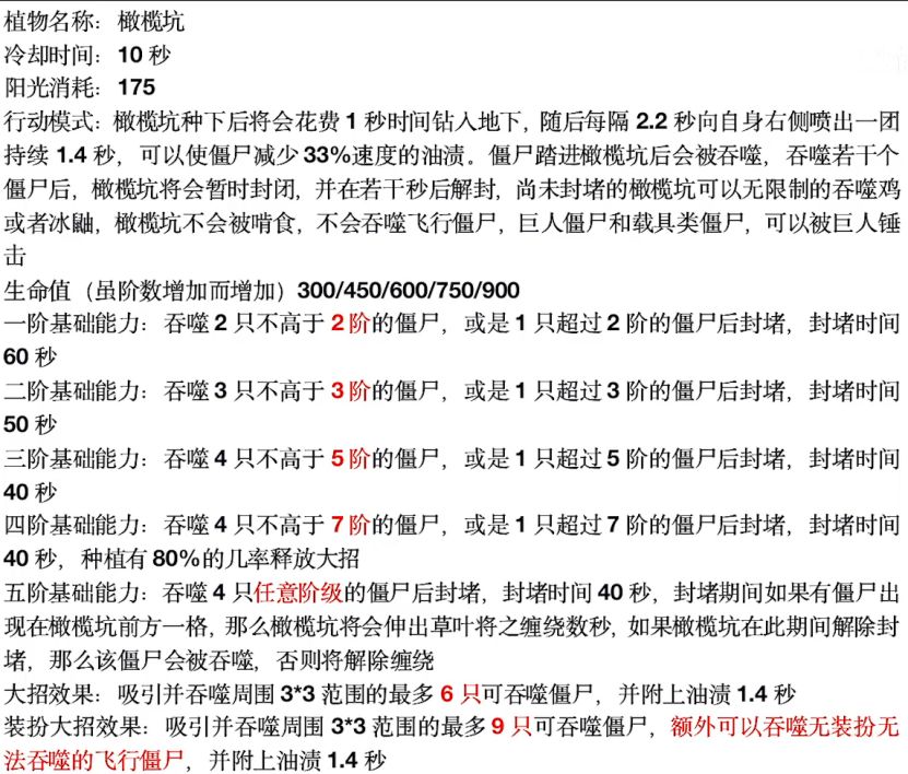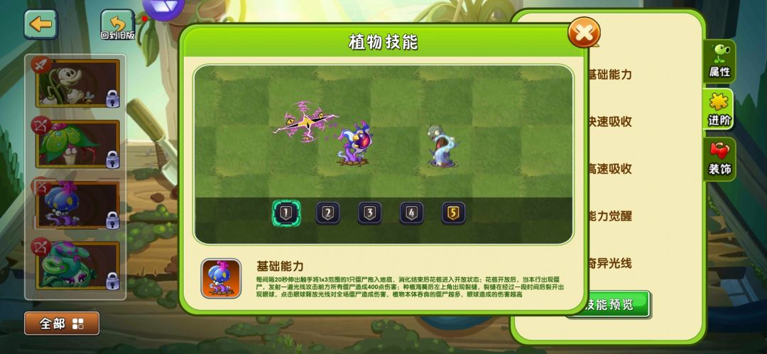 普攻:吞噬前方僵尸经过消化后发射一道激光攻击本行全部,可以1阶吞10阶,可吞噬僵尸种类类似于食人花豌豆,,部分中小型和铜人,吞噬时先眩晕后拉入地下,故可以直接吞掉10阶鸡哥和鼬哥而不放出小动物,但由于其休息时间太长,索敌距离太短,造价太高昂,所以我选择秘宝食人豌,升阶增加伤害减少消化时间,种植后,左上角出现裂缝,裂缝在一段时间后裂开出现眼球,点击眼球可对全场敌人造成百分比伤害,本体吞噬数越多,眼球伤害越高,5阶技能是消化后发射的激光可将接触到的第一个中小体型变为我方的道侣僵尸,上限为5阶