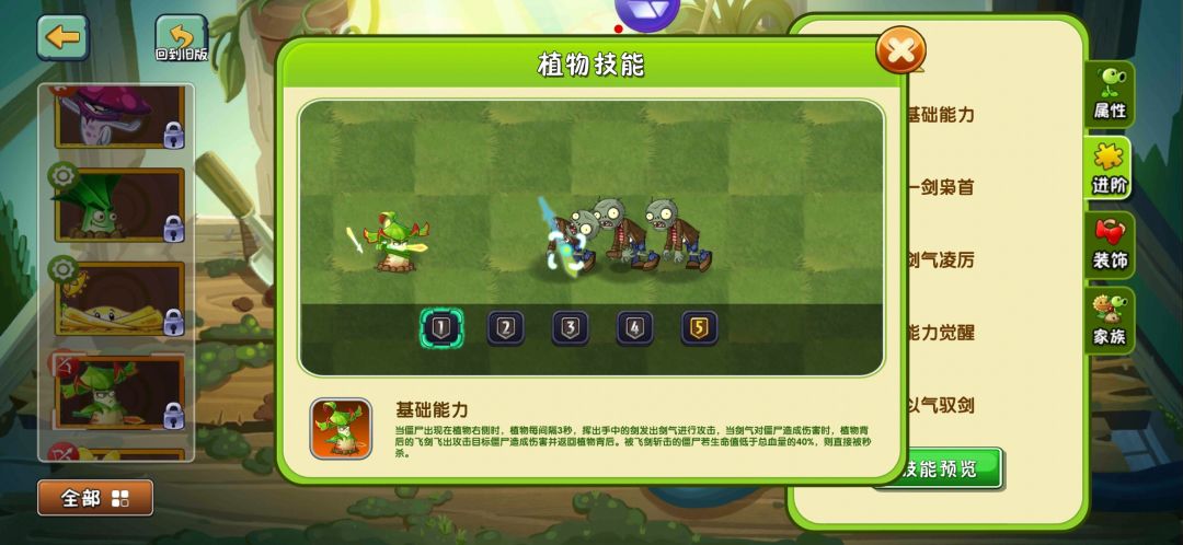 普攻:每3秒发出剑气攻击右侧僵尸,继而飞出身后飞剑对目标造成伤害并斩杀低于40%雪亮的敌人,2阶斩杀线增加到50%,3阶变为群体单格斩杀,5阶概率合出一把巨剑,攻击整行僵尸并斩杀低于50%血量的敌人
