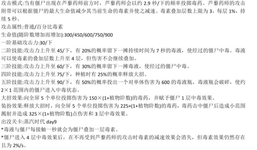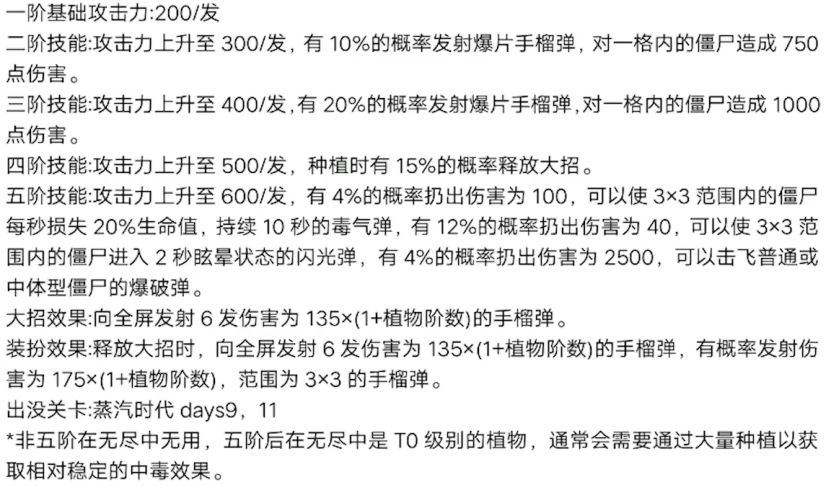 总结:5阶启用,无尽真正的神,5阶4%概率(满基因可再增加3%)扔出3*3,20%毒伤,持续10秒的毒气弹,就这3条任选1条放到任何一个其他毒属植物上都比较强了,而它居然逆天的全部占有,唯一的不足就是出毒率偏低,通过合理密植和基因编辑可以轻松解决该问题,但我还是选择499超值大礼包谢谢,装扮不必要,挂件建议紫手套