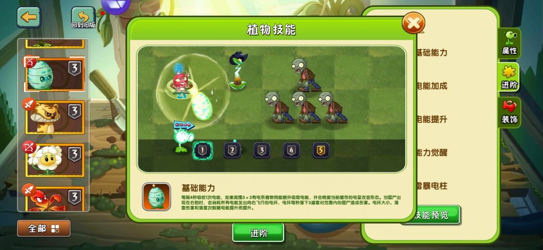 普攻:可以吸取周围3*3电系植物的电能,消耗所有电能形成一个电环缓慢向右移动攻击右侧僵尸,电环接触到目标僵尸会每秒落下三道雷,电环大小,雷击伤害和落雷次数随所蓄电能多少而改变,2阶电环可给范围内的电系植物额外附加攻击力加成,升阶提升攻击力加成幅度,5阶落雷概率变为单格群伤雷柱