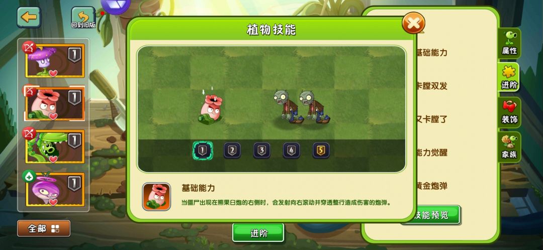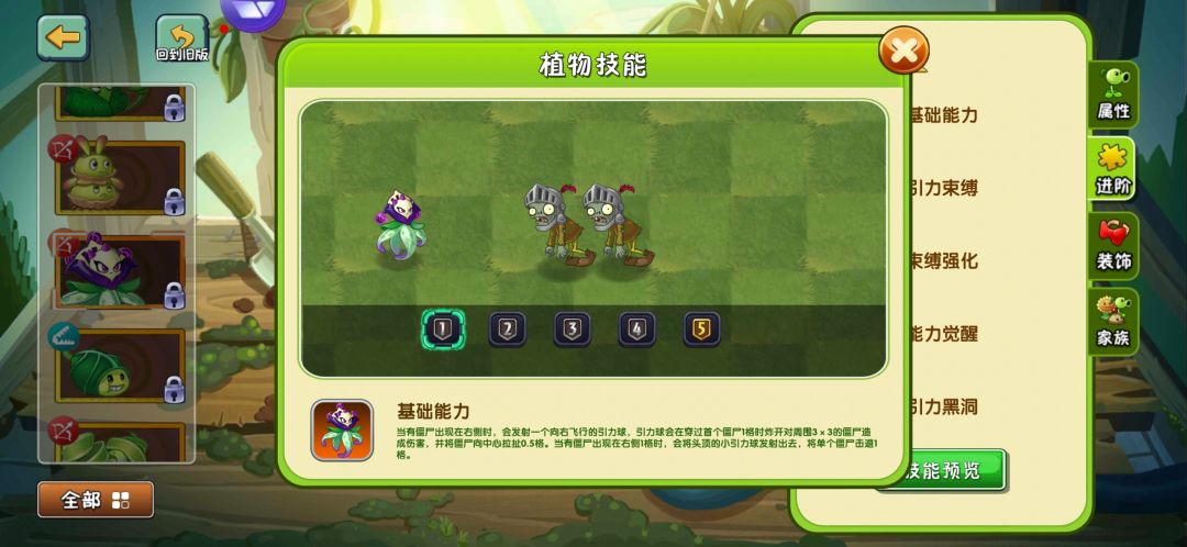普攻:发射一枚引力黑洞球,吸引聚集普通僵尸,当僵尸进入其前方一格区域内时,可使用其身上聚集的魔法能量球击退目标僵尸,用完即止,5阶就是类似于保龄泡泡可以自动恢复,同时可以直接扔出三颗聚集的能量球,该攻击可以将中小体型僵尸拖入黑洞中心秒杀,5阶才可以吸引巨人,升阶提高“禁锢”概率,禁锢可以理解为眩晕,一种类似的控制效果,持续时间较短
