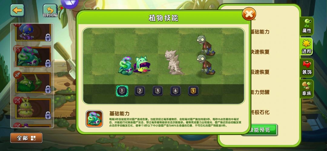 普攻:释放蛇灵攻击右侧目标,蛇灵穿过毒系植物颜色变深,变为可弹射状态,可使僵尸中毒,手动点击该植物可以石化右侧僵尸,石化阶级数过高的僵尸只会造成眩晕,可石化上限随阶级提高,依次为1/3/5/7/10,该石化实质是先杀死再生成雕像,故西部冰河谨慎使用,当僵尸走进距其四格内时,可以主动石化,升阶缩短石化休息时间,5阶概率石化两个僵尸