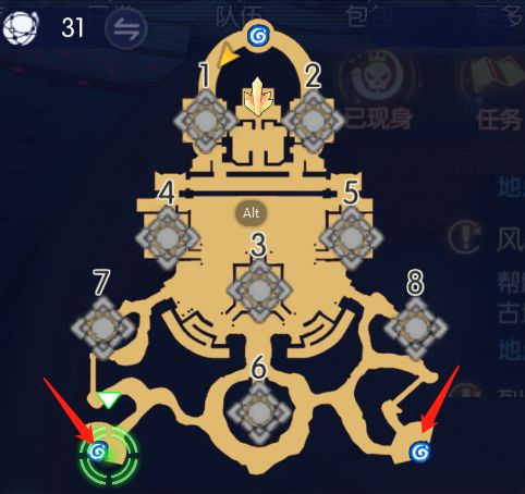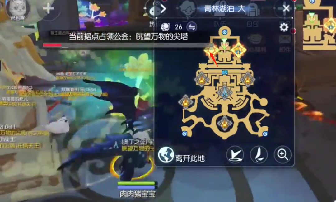 看图10的情况下,如果公会占据了一个点,就可以点这个公会图标传送,反之,没占领到就无法快速传送到据点,印象中冷却30s(待验证),所有据点是同一个公会占领,水晶就是无敌状态,看图11,黄色的圈圈就表示没有占领的,这个版本会有bug,有时候显示会错误。