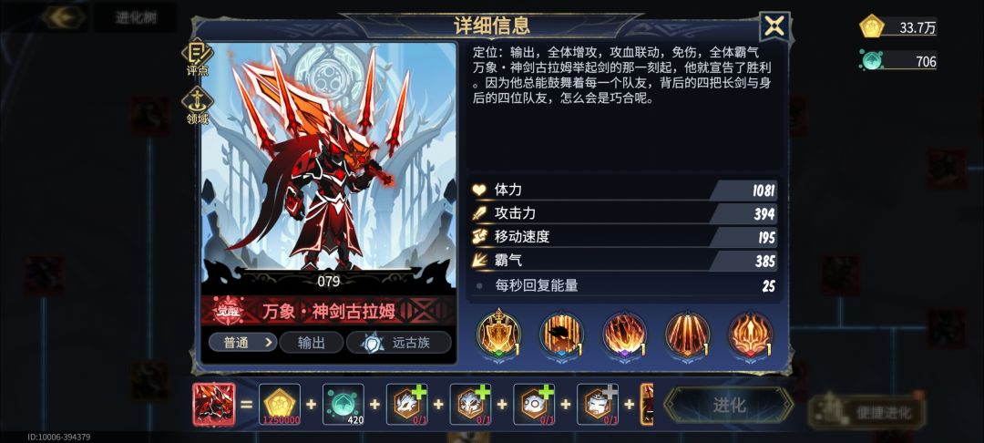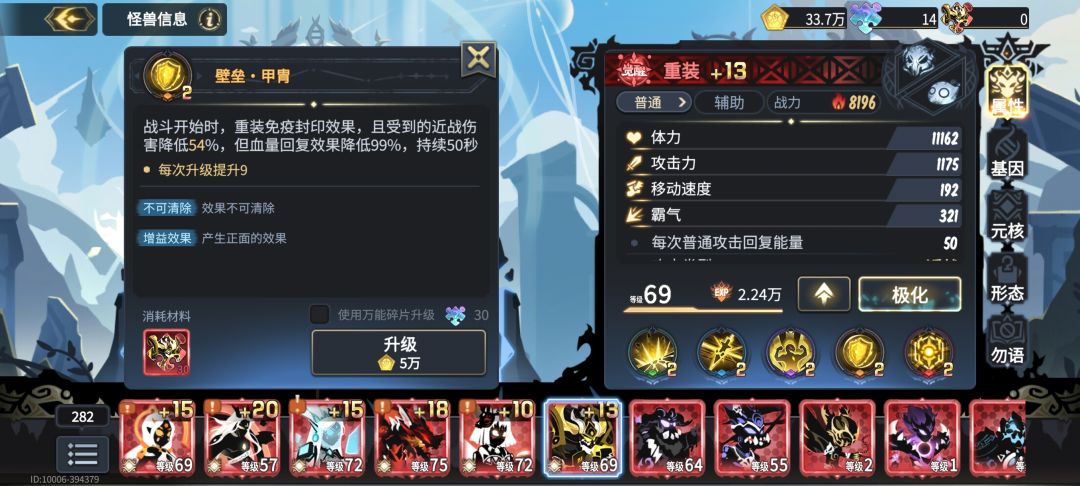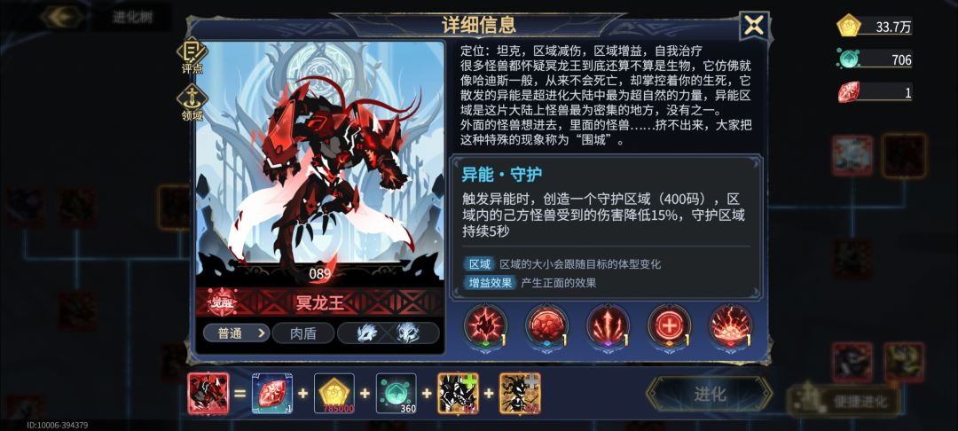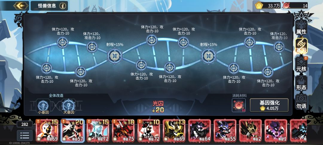 前面近战小基因全部120体力,这里就有人说了霸气生物屏障那些不要吗,我的评价是什么霸气那些不是现在该想的,先玩2个月再说,血量不够推图都推不过,大基因看角色,我建议可以自己看下技能介绍,别无脑抄攻略,举个例子,冥龙王有一个技能是会放一个圈圈,会给圈内的角色提供减伤效果