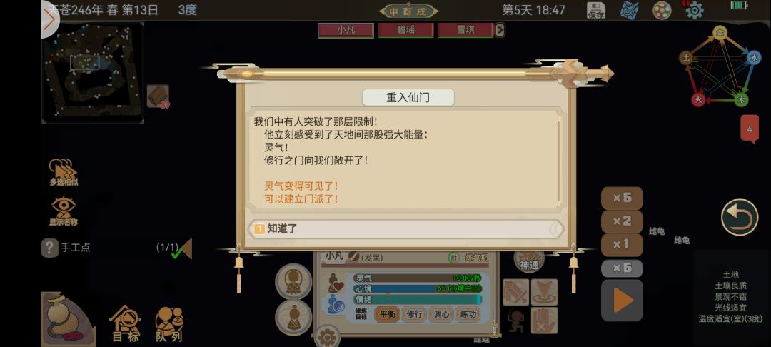 当我们把初入江湖里面十个任务做完了,这时候小人筑基值也应该够了,然后让未来掌门晋升,踏入仙道!开宗立派,在葫芦里解锁门派选项!