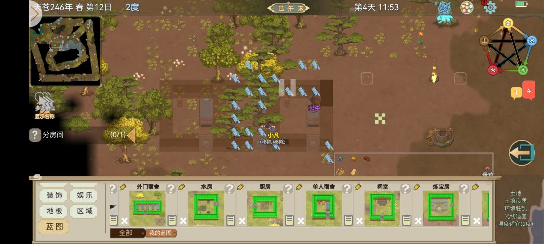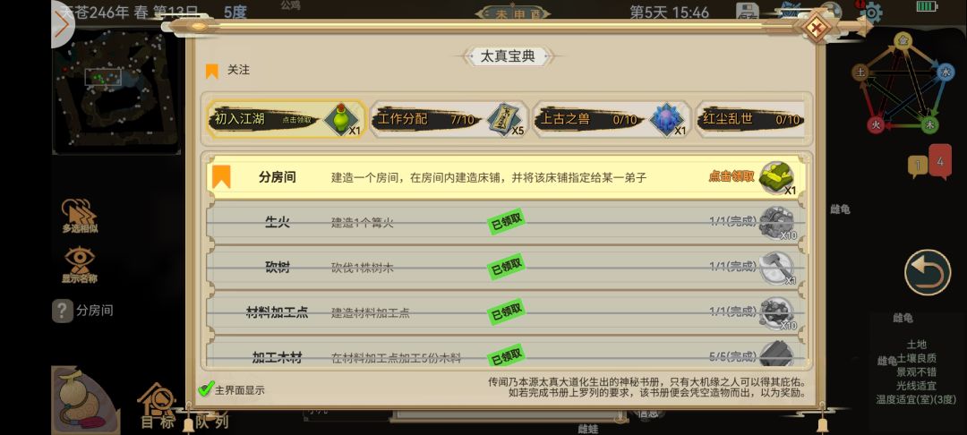 在这里,我们要学会看地图和打开地图,左上角第一行是游戏年月季节,点开可以看天气,下面就是地图啦,在图里你可以清晰看到自己位置,右上角最右边开始数依次是手机电量,系统设置,五行显示,地图开关,游戏里的时间![[嗒啦啦4_比心]](https://img.tapimg.com/market/images/d28961d9ef2d62e62333b8d17a8612dc.gif)