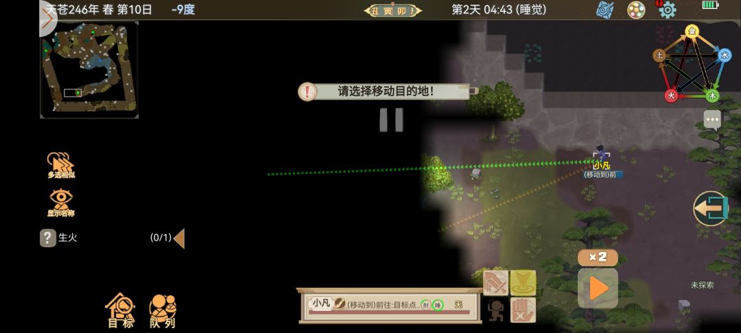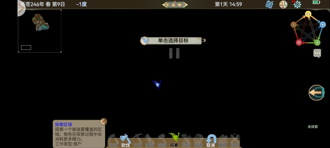 在做系统任务时记得先派小人探索地图,这里我们定下个目标,花个几天时间把全图阴影探索完,我们可以点出左下角的葫芦操作界面设置探索节点放在地图阴影上让小人自动去探索,也可以自己控制小人去行走。