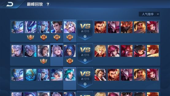 此外为了便于大家选择精彩的对局,区别于实时观战的播放人数,回放中我们新增了【人气值】,人气值由播放量及玩家互动数综合计算得出,左上方可分别根据人气/对局平均巅峰赛分数/游戏时间进行排序: