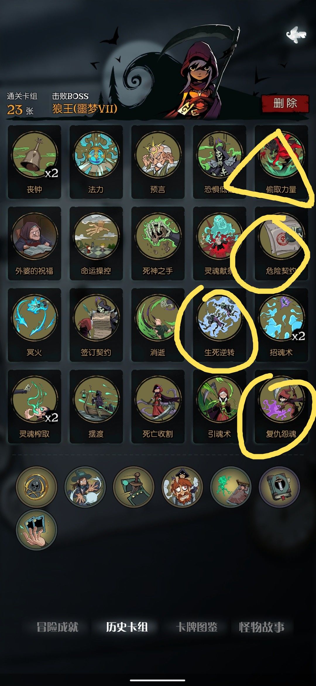 利用咒术牌:生死轮转(效果让未损失生命和已损失生命交换)行动牌:危险契约(生命降低为1,本回合伤害加倍)我记得有个行动牌可以找回指定的已消耗的牌复仇卡:介绍略理论上,轮转个2回合,就能秒杀狼王啦