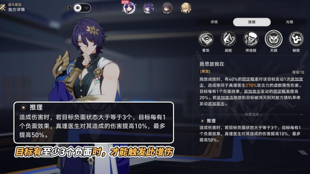 目前0星魂真理医生上限也就6层,搭配佩拉也可较快叠满这个双暴增益效果。此外,【额外能力「推理」】则是赋予了真理医生增伤数值。造成伤害时,若敌人身上负面状态至少3层,此时每层都可提升10%增伤,至多50%。叠满5层需要看具体配队与角色了,但单目标叠3层还是较容易的。