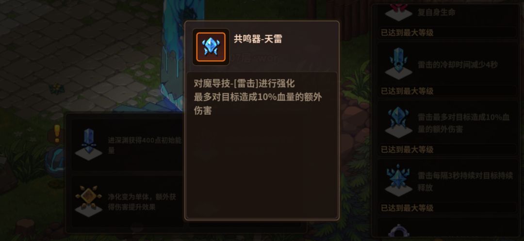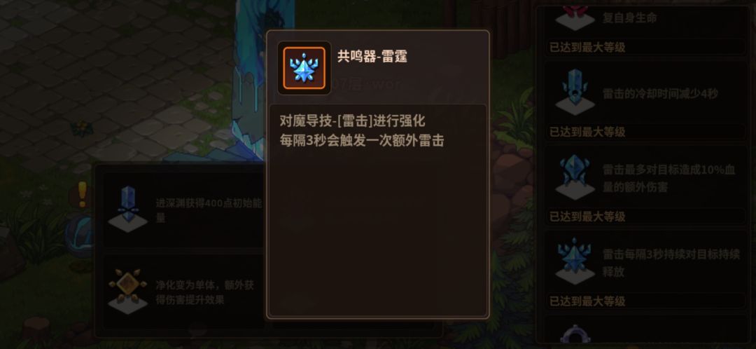 特点:不愧是雷击,怎么强化改变都只有一格蓝耗,就这一点已经赢某些共鸣太多了,舍弃无限雷换来的是极强的开局削血能力,血越多雷伤害越高,但得注意的是当前血量的百分之十。