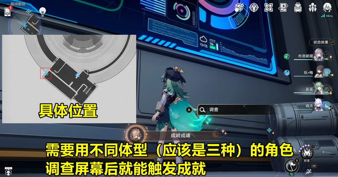 【成岭成峰】:来到下方靠近墙壁的位置,能看到墙壁上挂着一个屏幕,靠近有调查选项。如果用不同体型的角色去调查的话,会触发隐藏成就“成岭成峰”。个人是换了三种体型的角色,分别调查后就触发了。
