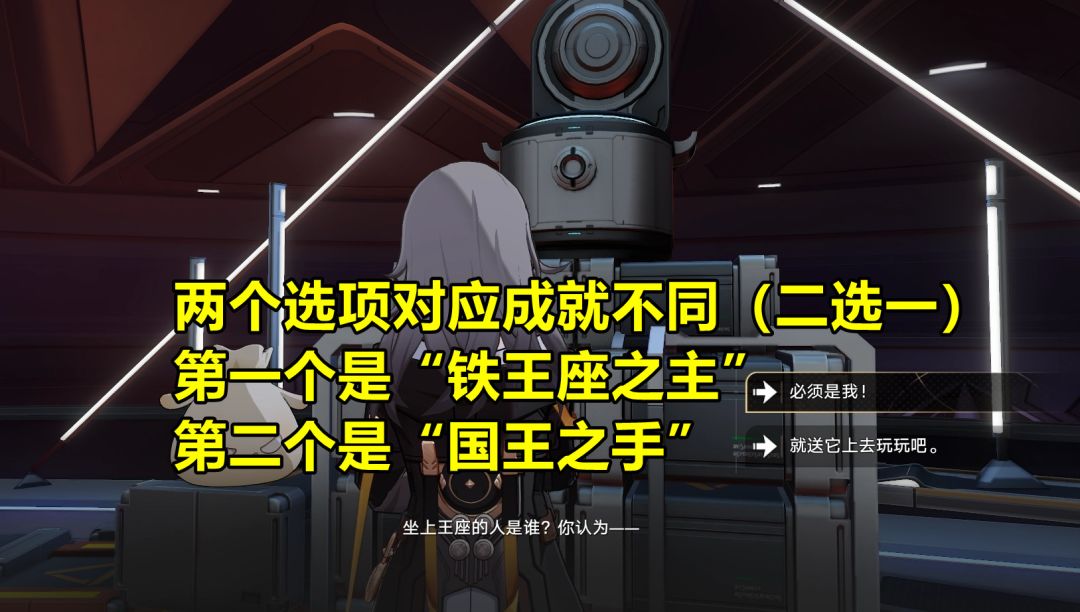 对话后提示让我们到指定地点搬“电饭锅”,跟着任务提示走就行。最后回到箱子的位置,出现分支选项:如果选择“必须是我!”,需要先消耗一个崇高的赞许,剧情过后获得“铁王座之主”;如果选择“就送它上去玩玩吧”,则获得成就“国王之手”,并获得一个崇高赞许。
